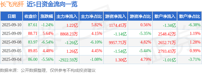 证券之星消息,截至2025年9月10日收盘,长飞光纤(601869)报收于87.61元,下跌1.24%,换手率5.91%,成交量24.02万手,成交额20.97亿元。