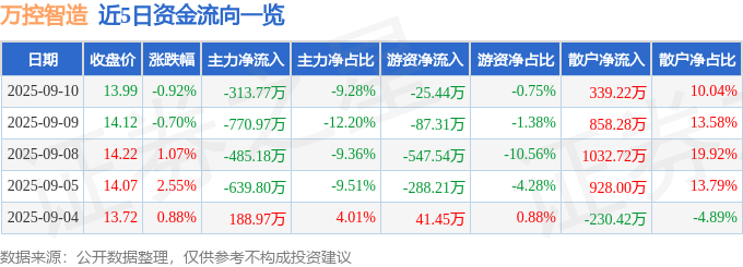 证券之星消息,截至2025年9月10日收盘,万控智造(603070)报收于13.99元,下跌0.92%,换手率0.61%,成交量2.41万手,成交额3380.14万元。