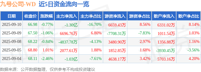 证券之星消息,截至2025年9月10日收盘,九号公司(689009)报收于66.98元,下跌0.77%,换手率2.08%,成交量11.55万手,成交额7.78亿元。