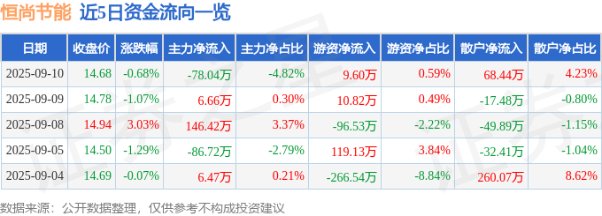 证券之星消息,截至2025年9月10日收盘,恒尚节能(603137)报收于14.68元,下跌0.68%,换手率1.49%,成交量1.1万手,成交额1617.45万元。