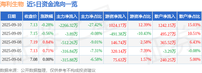证券之星消息,截至2025年9月10日收盘,海利生物(603718)报收于7.13元,下跌0.28%,换手率1.79%,成交量11.64万手,成交额8265.78万元。