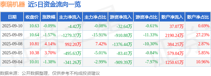 证券之星消息,截至2025年9月10日收盘,泰瑞机器(603289)报收于10.63元,下跌0.09%,换手率1.72%,成交量5.04万手,成交额5354.63万元。