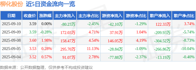 证券之星消息,截至2025年9月10日收盘,柳化股份(600423)报收于3.59元,上涨0.0%,换手率1.14%,成交量9.11万手,成交额3271.25万元。