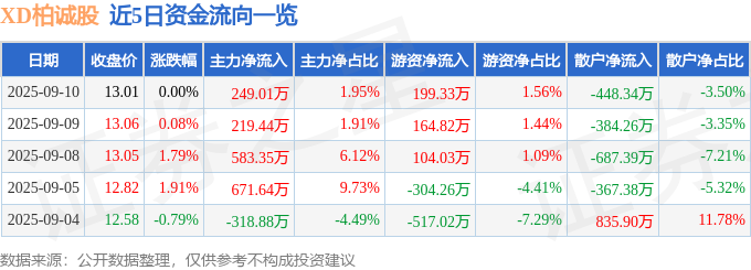 9月10日的资金流向数据方面,主力资金净流入249.01万元,占总成交额1.95%,游资资金净流入199.33万元,占总成交额1.56%,散户资金净流出448.34万元,占总成交额3.5%。