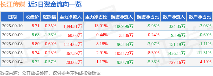 证券之星消息,截至2025年9月10日收盘,长江传媒(600757)报收于8.71元,上涨0.35%,换手率1.02%,成交量12.32万手,成交额1.07亿元。