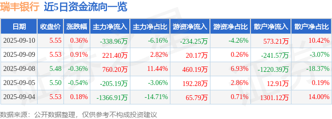 证券之星消息,截至2025年9月10日收盘,瑞丰银行(601528)报收于5.55元,上涨0.36%,换手率0.57%,成交量9.94万手,成交额5501.83万元。