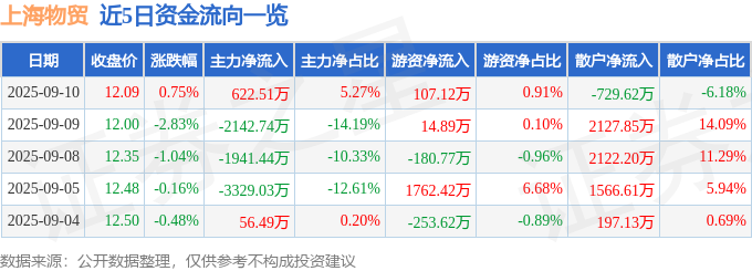 证券之星消息,截至2025年9月10日收盘,上海物贸(600822)报收于12.09元,上涨0.75%,换手率2.45%,成交量9.72万手,成交额1.18亿元。