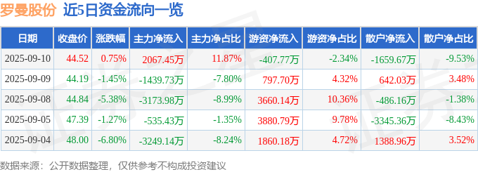 证券之星消息,截至2025年9月10日收盘,罗曼股份(605289)报收于44.52元,上涨0.75%,换手率3.58%,成交量3.88万手,成交额1.74亿元。