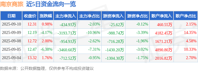 证券之星消息,截至2025年9月10日收盘,南京商旅(600250)报收于12.31元,上涨0.98%,换手率5.62%,成交量17.45万手,成交额2.15亿元。