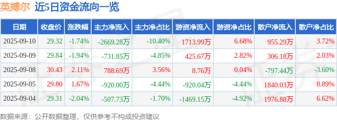9月10日的资金流向数据方面,主力资金净流出2669.28万元,占总成交额10.4%,游资资金净流入1713.99万元,占总成交额6.68%,散户资金净流入955.29万元,占总成交额3.72%。