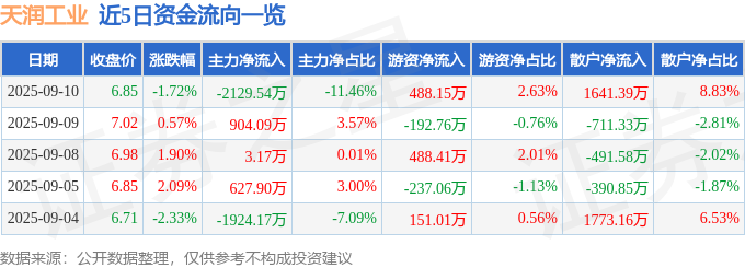证券之星消息,截至2025年9月10日收盘,天润工业(002283)报收于6.85元,下跌1.72%,换手率2.69%,成交量27.02万手,成交额1.86亿元。