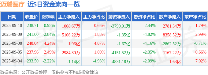 证券之星消息,截至2025年9月10日收盘,迈瑞医疗(300760)报收于238.71元,下跌0.95%,换手率0.53%,成交量6.48万手,成交额15.53亿元。