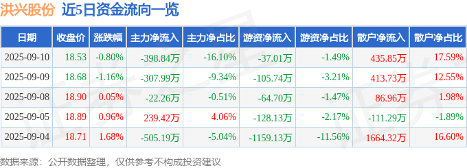 证券之星消息,截至2025年9月10日收盘,洪兴股份(001209)报收于18.53元,下跌0.8%,换手率1.38%,成交量1.33万手,成交额2477.94万元。