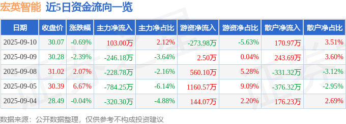 证券之星消息,截至2025年9月10日收盘,宏英智能(001266)报收于30.07元,下跌0.69%,换手率2.81%,成交量1.61万手,成交额4868.72万元。