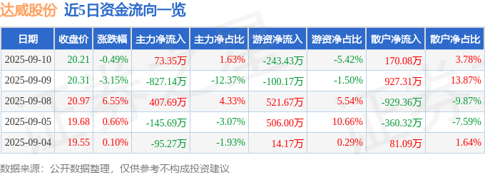 证券之星消息,截至2025年9月10日收盘,达威股份(300535)报收于20.21元,下跌0.49%,换手率2.92%,成交量2.23万手,成交额4494.14万元。