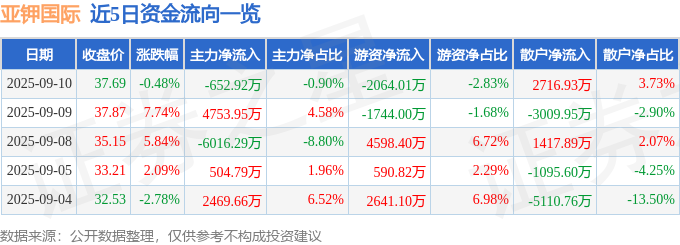 证券之星消息,截至2025年9月10日收盘,亚钾国际(000893)报收于37.69元,下跌0.48%,换手率2.4%,成交量19.47万手,成交额7.29亿元。