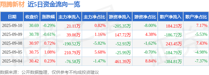 证券之星消息,截至2025年9月10日收盘,翔腾新材(001373)报收于30.69元,下跌0.29%,换手率2.53%,成交量8373.0手,成交额2568.29万元。