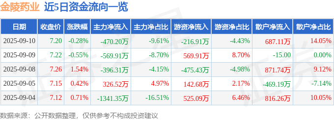 证券之星消息,截至2025年9月10日收盘,金陵药业(000919)报收于7.2元,下跌0.28%,换手率1.15%,成交量6.79万手,成交额4891.16万元。