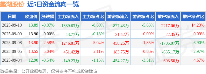9月10日的资金流向数据方面,主力资金净流出1339.63万元,占总成交额8.6%,游资资金净流出877.43万元,占总成交额5.63%,散户资金净流入2217.06万元,占总成交额14.23%。