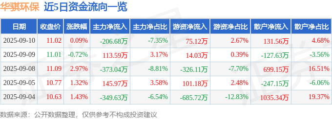 证券之星消息,截至2025年9月10日收盘,华骐环保(300929)报收于11.02元,上涨0.09%,换手率2.01%,成交量2.55万手,成交额2810.15万元。