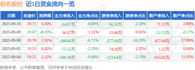 9月10日的资金流向数据方面,主力资金净流出14.87万元,占总成交额0.6%,游资资金净流出56.5万元,占总成交额2.28%,散户资金净流入71.37万元,占总成交额2.88%。