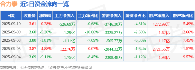 证券之星消息,截至2025年9月10日收盘,合力泰(002217)报收于3.61元,上涨0.28%,换手率3.81%,成交量216.23万手,成交额7.79亿元。