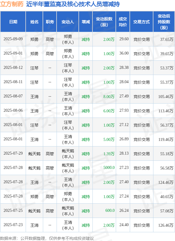 立方制药近半年内的董监高及核心技术人员增减持详情如下: