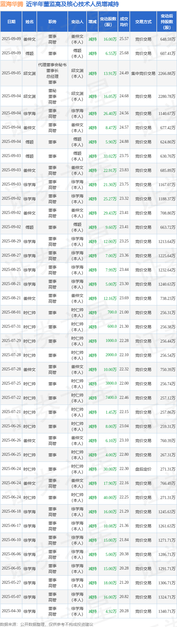 蓝海华腾近半年内的董监高及核心技术人员增减持详情如下: