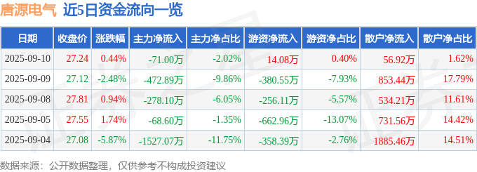 证券之星消息,截至2025年9月10日收盘,唐源电气(300789)报收于27.24元,上涨0.44%,换手率1.3%,成交量1.29万手,成交额3516.14万元。
