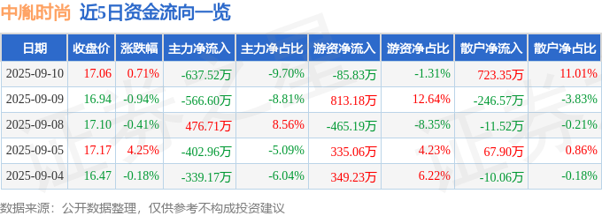 证券之星消息,截至2025年9月10日收盘,中胤时尚(300901)报收于17.06元,上涨0.71%,换手率1.62%,成交量3.88万手,成交额6569.98万元。