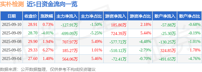 证券之星消息,截至2025年9月10日收盘,实朴检测(301228)报收于28.91元,上涨0.73%,换手率2.46%,成交量2.95万手,成交额8524.34万元。