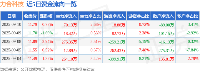9月10日的资金流向数据方面,主力资金净流入70.13万元,占总成交额2.68%,游资资金净流入18.88万元,占总成交额0.72%,散户资金净流出89.0万元,占总成交额3.41%。