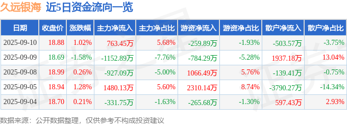 证券之星消息,截至2025年9月10日收盘,久远银海(002777)报收于18.88元,上涨1.02%,换手率1.77%,成交量7.14万手,成交额1.34亿元。