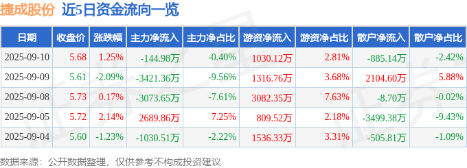 证券之星消息,截至2025年9月10日收盘,捷成股份(300182)报收于5.68元,上涨1.25%,换手率2.85%,成交量64.43万手,成交额3.66亿元。