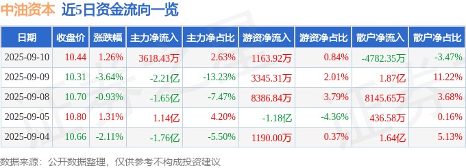 证券之星消息,截至2025年9月10日收盘,中油资本(000617)报收于10.44元,上涨1.26%,换手率1.04%,成交量131.84万手,成交额13.78亿元。