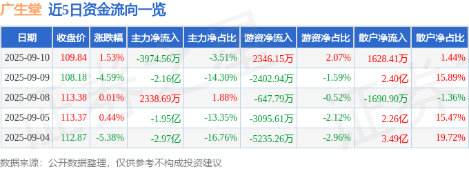 证券之星消息,截至2025年9月10日收盘,广生堂(300436)报收于109.84元,上涨1.53%,换手率7.5%,成交量10.26万手,成交额11.33亿元。