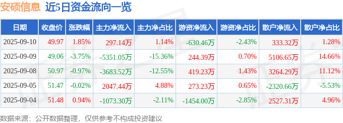 证券之星消息,截至2025年9月10日收盘,安硕信息(300380)报收于49.97元,上涨1.85%,换手率4.09%,成交量5.22万手,成交额2.6亿元。