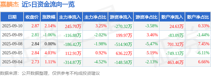 9月10日的资金流向数据方面,主力资金净流入245.7万元,占总成交额3.25%,游资资金净流出270.32万元,占总成交额3.58%,散户资金净流入24.63万元,占总成交额0.33%。