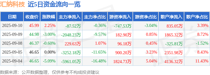 证券之星消息,截至2025年9月10日收盘,汇纳科技(300609)报收于45.99元,上涨2.25%,换手率4.42%,成交量5.29万手,成交额2.46亿元。