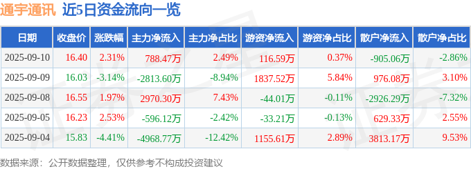 证券之星消息,截至2025年9月10日收盘,通宇通讯(002792)报收于16.4元,上涨2.31%,换手率5.78%,成交量19.28万手,成交额3.16亿元。
