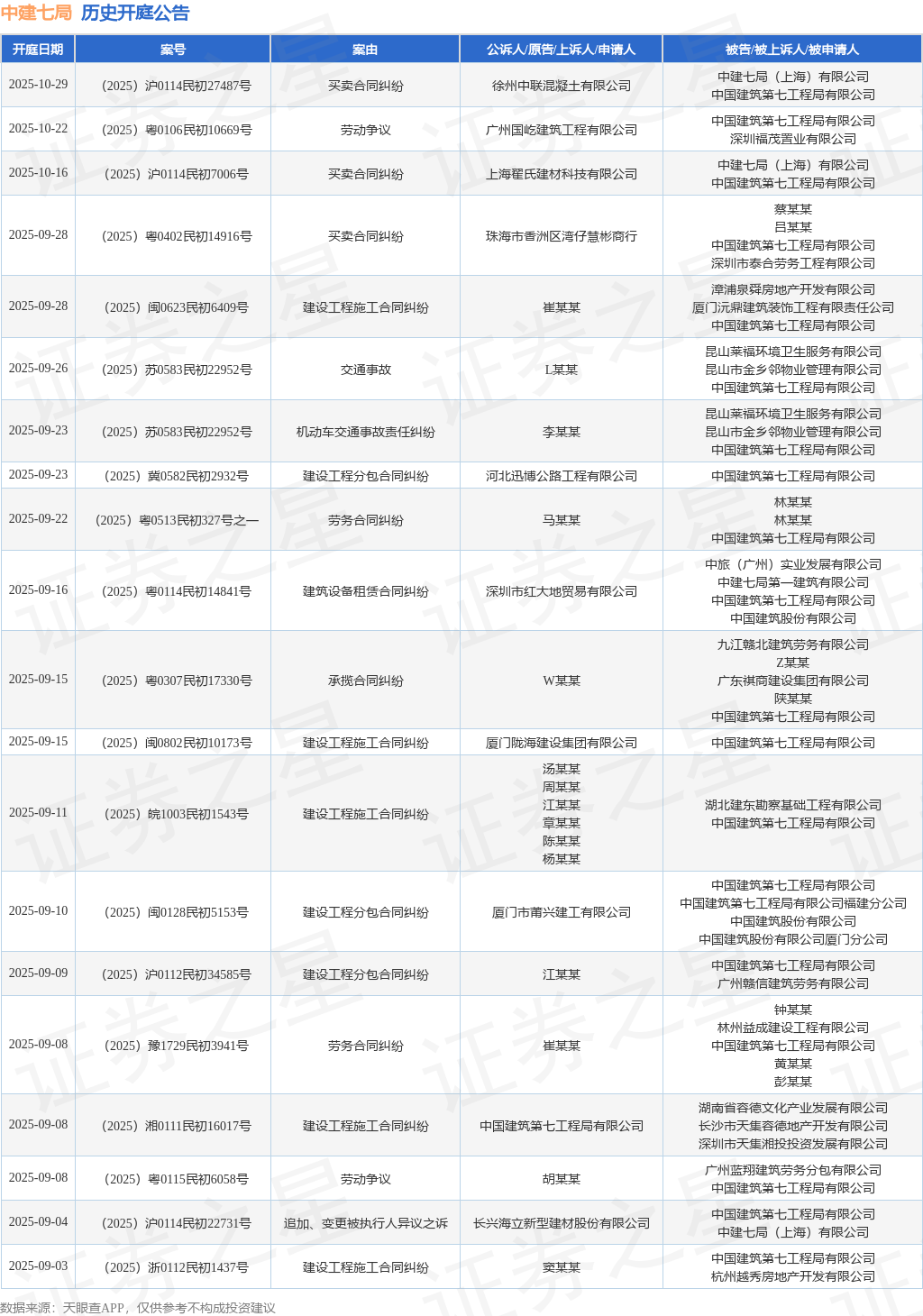 案号:(2025)皖1003民初1543号根据统计,近一年内以中国建筑第七工程局有限公司为当事人的历史开庭公告有1004则,其中案由为“买卖合同纠纷”的公告以287则居首,其次为“劳务合同纠纷”有146则,“建设工程施工合同纠纷”有135则。历史开庭公告(前20条)如下: