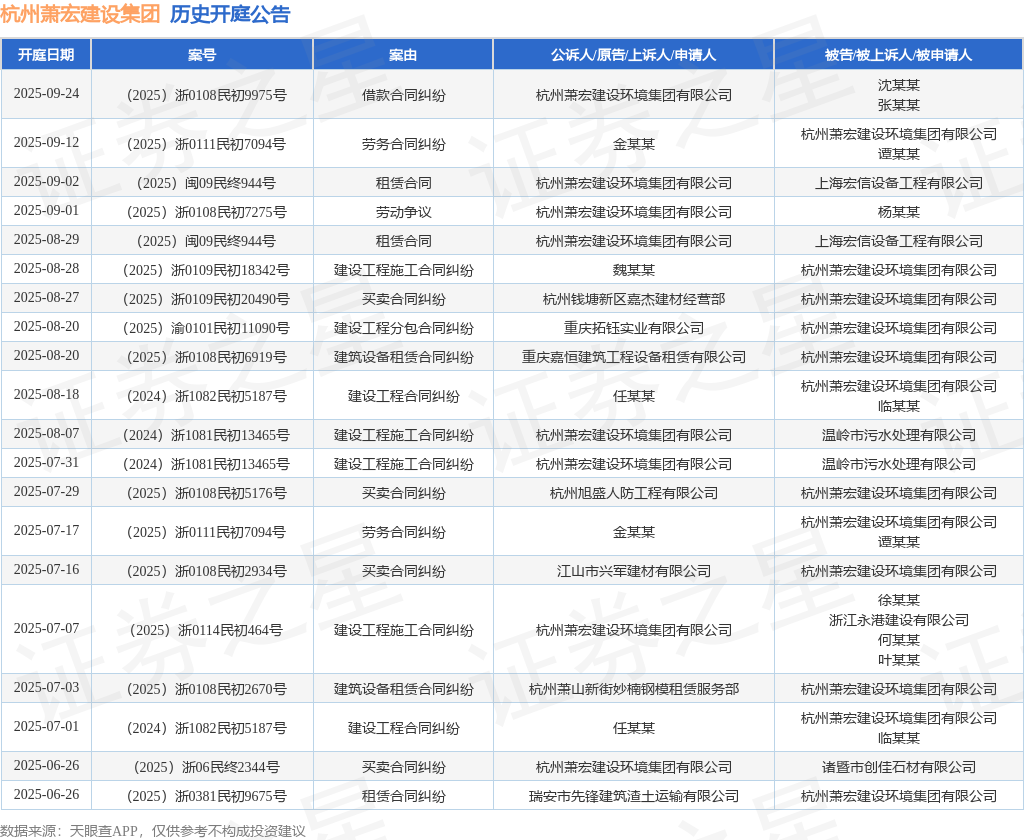 案号:(2025)浙0111民初7094号根据统计,近一年内以杭州萧宏建设环境集团有限公司为当事人的历史开庭公告有82则,其中案由为“买卖合同纠纷”的公告以11则居首,其次为“建筑设备租赁合同纠纷”有11则,“建设工程施工合同纠纷”有11则。历史开庭公告(前20条)如下: