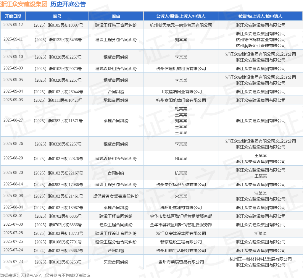 案号:(2025)浙0105民初18397号根据统计,近一年内以浙江众安建设集团有限公司为当事人的历史开庭公告有73则,其中案由为“建设工程合同纠纷”的公告以12则居首,其次为“合同纠纷”有9则,“建设工程分包合同纠纷”有9则。历史开庭公告(前20条)如下: