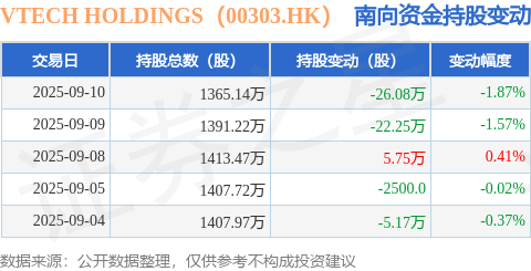证券之星消息,9月10日南向资金减持26.08万股VTECH HOLDINGS(00303.HK)。近5个交易日中,获南向资金减持的有4天,累计净减持48.0万股。近20个交易日中,获南向资金减持的有9天,累计净减持21.42万股。截至目前,南向资金持有VTECH HOLDINGS(00303.HK)1365.14万股,占公司已发行普通股的5.38%。