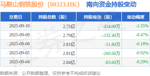 证券之星消息,9月10日南向资金减持434.0万股马鞍山钢铁股份(00323.HK)。近5个交易日中,获南向资金减持的有5天,累计净减持962.4万股。近20个交易日中,获南向资金减持的有13天,累计净减持3286.0万股。截至目前,南向资金持有马鞍山钢铁股份(00323.HK)2.75亿股,占公司已发行普通股的15.87%。