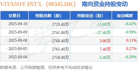 证券之星消息,9月10日南向资金减持11.6万股VITASOY INT'L(00345.HK)。近5个交易日中,获南向资金减持的有3天,累计净减持34.0万股。近20个交易日中,获南向资金增持的有15天,累计净增持244.4万股。截至目前,南向资金持有VITASOY INT'L(00345.HK)2729.4万股,占公司已发行普通股的2.59%。