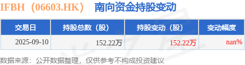 证券之星消息,9月10日南向资金增持152.22万股IFBH(06603.HK)。截至目前,南向资金持有IFBH(06603.HK)152.22万股,占公司已发行普通股的0.56%。