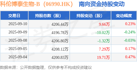 证券之星消息,9月10日南向资金增持9.66万股科伦博泰生物-B(06990.HK)。近5个交易日中,获南向资金增持的有3天,累计净增持25.32万股。近20个交易日中,获南向资金增持的有14天,累计净增持195.26万股。截至目前,南向资金持有科伦博泰生物-B(06990.HK)4206.44万股,占公司已发行普通股的25.84%。