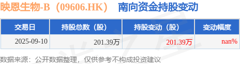 证券之星消息,9月10日南向资金增持201.39万股映恩生物-B(09606.HK)。截至目前,南向资金持有映恩生物-B(09606.HK)201.39万股,占公司已发行普通股的2.27%。