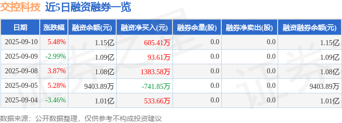 交控科技融资融券信息显示,融资方面,当日融资买入2575.68万元,融资偿还1970.28万元,融资净买入605.41万元,连续3日净买入累计2082.59万元。融券方面,融券卖出0.0股,融券偿还0.0股,融券余量0.0股,融券余额0.0万元。融资融券余额1.15亿元。